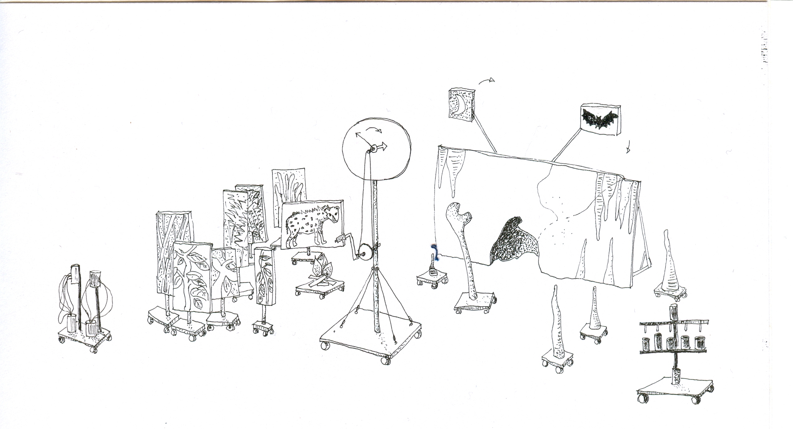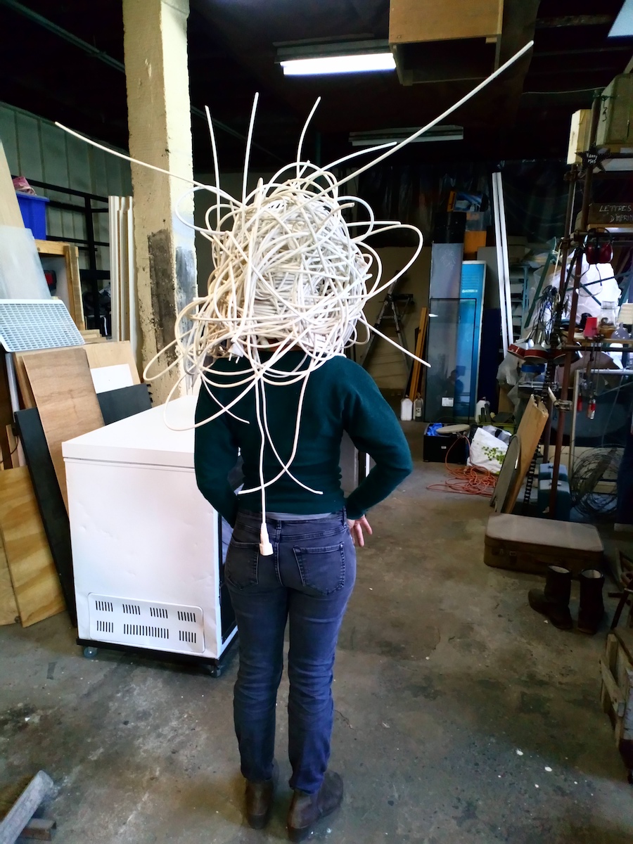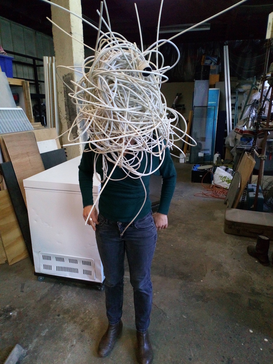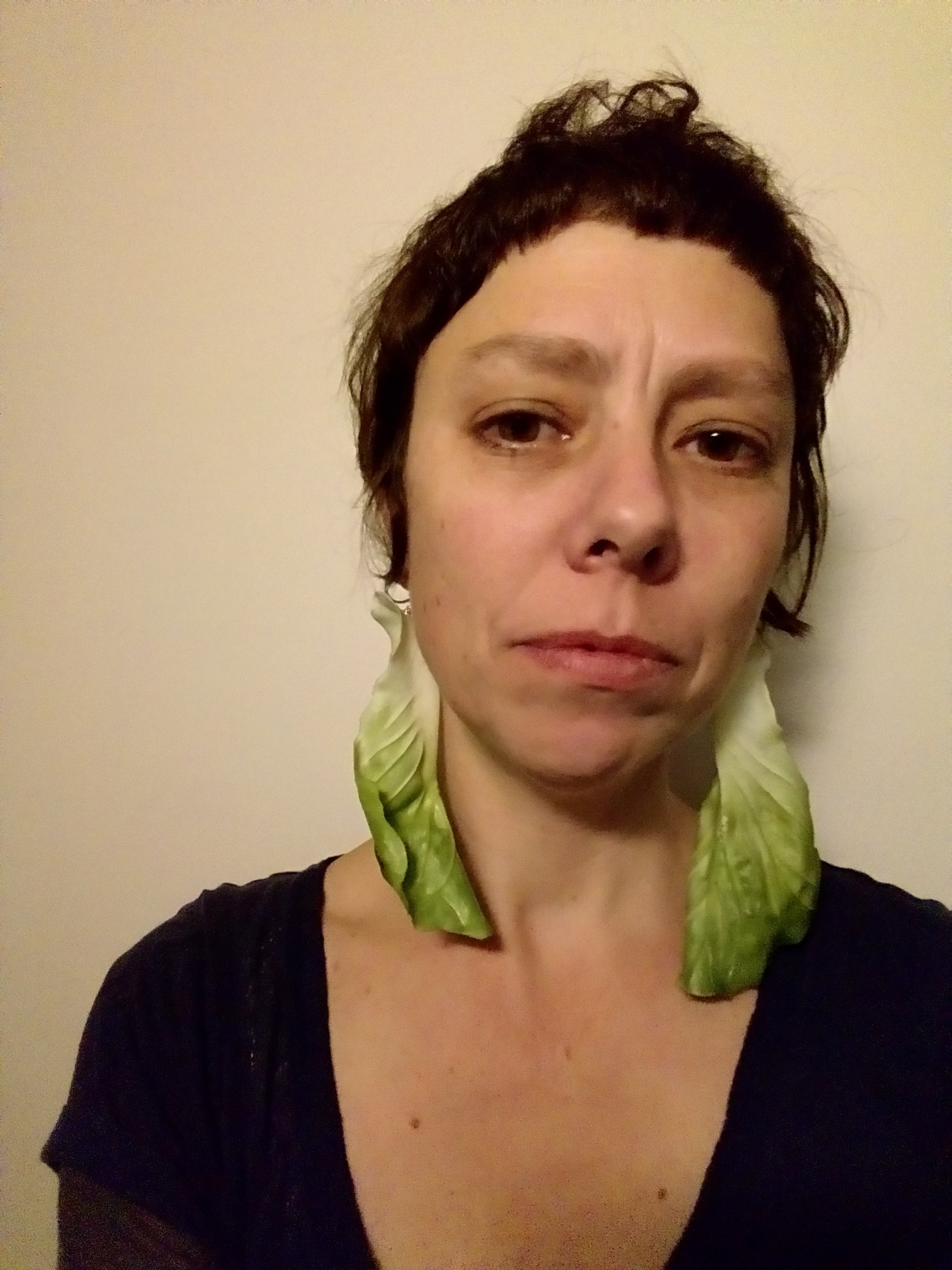 En vrac dessins, boucles d’oreilles laitue, tête électrique barbare, photo train, esquisses décors, socle masque, sculpture béton, mais à quoi sert cet objet, tissus cousus....